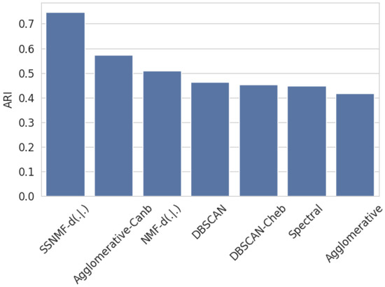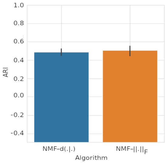 In this section, we present a comparative study of the clustering algorithms using the selected parameter values. For unsupervised clustering, we observed ARI (9) values of 0.51 and 0.49 for NMF- and NMF-, respectively (Figure 6). The presented results were obtained for the parameter k, denoting the number of clusters obtained during cross-validation. Table 4 presents the mean ARI values with standard deviations.