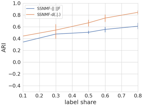 For unsupervised non-negative matrix factorization (NMF), the sole parameter k determines the number of clusters. For semi-supervised non-negative matrix factorization (SSNMF), an additional parameter, , governs the relative importance of the supervision term. Intuitively, expresses the confidence in the quality of the labels: the larger its value, the more the clustering is influenced by the labels. The parameter k should ideally be close to the expected number of clusters, but, in practical scenarios, this information is often not readily accessible. Therefore, these parameters must be tuned based on some metric, which, in our experiment, is ARI. Future research will evaluate the robustness of the algorithms to different parameter settings.