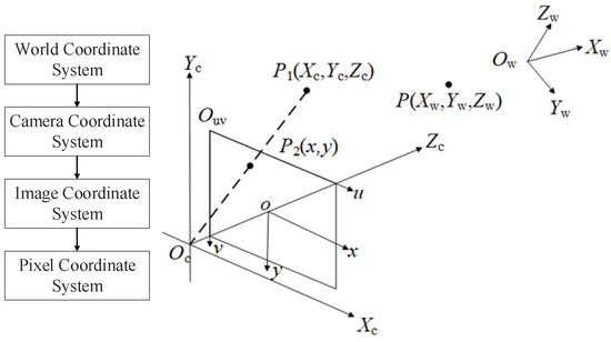 The imaging process of a camera involves transforming a three-dimensional scene into a two-dimensional color image. Essentially, this process entails a series of coordinate transformations, wherein the world coordinate system is converted into the pixel coordinate system, as in Figure 1.