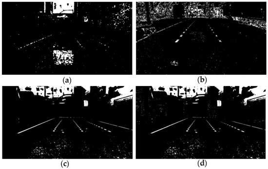 The HLS color space comprises three components: H (hue), L (lightness), and S (saturation). The allowable ranges for H, L, and S are typically defined as [0, 179], [0, 255], and [0, 255], respectively. In the HLS color space, white is solely determined by the lightness component (L), and most of the lane lines are white, as employing HLS enhances the accuracy of lane detection. The conversion from RGB to HLS is achieved through the application of (15). The values of R, G, and B are real values within the range of [0, 1], , , so . The conversion to the HLS color space is illustrated in Figure 2b.