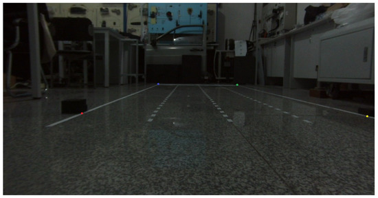 The image processed by the initial frame’s IPM shows that the conversion ratio between the longitudinal and lateral pixel distances in the pre-selected area and their actual distances can be calculated as follows: the pre-selected length along the vehicle’s direction is equivalent to 40 m, which is covered by 720 pixels; the width of a single lane is equivalent to 3.6 m, which is covered by 256 pixels.
