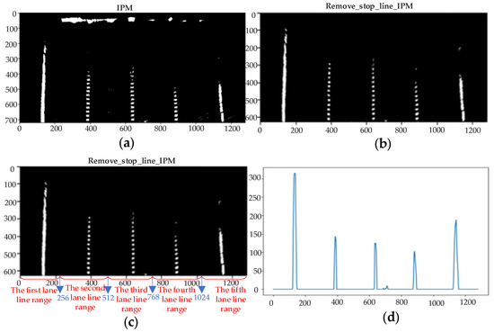 The lane line detection method, which is based on polynomial fitting of the bird’s-eye view [29], preprocesses the image. Subsequently, the road image is projected onto the bird’s-eye view, which serves to make the lane line information more concise and removes interference from the surrounding environment [30]. The pixel coordinates of five lane lines on pre-selected roads were obtained through a multi-directional sliding window based on the BEV. Prior to detecting lane lines, it was necessary to utilize a histogram to determine their positions. As illustrated in Figure 5a, with an image resolution of 1280 × 720, the quantity of white pixels was tallied for each column, resulting in 1280 values. These values were plotted on a pixel coordinate system, with the horizontal axis ranging from 0 to 1279, and the number of white pixels in each column representing the vertical axis. The IPM (inverse perspective mapping)-processed BEV was then combined with the histogram, which was based on the approximate horizontal coordinate range of each lane line, to identify the number of columns corresponding to the peak of the maximum number of white pixel dots. However, within the preselection zone, the detection of stop lines may cause some deviation in the location of the peak quantity relative to where the lane lines appear at the bottom of the image. To address this, the IPM without the stop lines was intercepted for the statistical histograms, as shown in Figure 5b–d.