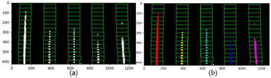 This process is repeated iteratively until the upper boundary of the sliding window reaches the top boundary of the image, at which point the search is terminated. As shown in Figure 6b, the coordinates of the pixel points of the five lane lines searched by the sliding window in the figure were recorded and are displayed respectively in red, yellow, green, blue, and purple.