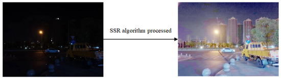 Statistical analysis of the proportion of pixels in the three frequency bands relative to the entire image being tested yields the following proportions: L, M, and H. If and simultaneously satisfies both and , then the current scene is a backlit scenario. If the backlit condition is not met and , then the current scene is a dimly lit scenario [38]. The SSR algorithm was employed to enhance images in non-normal scenarios. Figure 12 illustrates the enhancement effects of the SSR algorithm on two types of non-normal illumination images. It can be observed that the images exhibit greater vibrancy in color and clarity in contour.