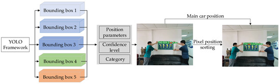 The precisely lane and traffic sign matching is crucial for autonomous driving [39]. In this section, the recognition results for the four-lane traffic signboard are orderly marked and outputted in a manner that aligns with the four lanes on the ground. Each lane must be sequentially labeled from left to right. In the YOLO model, the output of the types and related information of traffic signs in each frame of the image is unordered, which makes it impossible to match with the already marked ground lanes. Consequently, it was imperative to implement targeted modifications to the detection code within YOLO. During the detection and recognition process, the left upper corner horizontal coordinate pixel values of the four-lane traffic sign and each traffic sign prediction box are sorted, and the predicted boxes and related information of various traffic signs on the traffic sign board are outputted in sequence, with each lane on the traffic sign board being numbered. Concurrently, the current lane position information of the autonomous vehicle from Chapter 2 is utilized to provide feedback on the traffic signboard. The algorithmic process is depicted in Figure 13, where the location of “car” represents the current lane occupied by the autonomous vehicle.