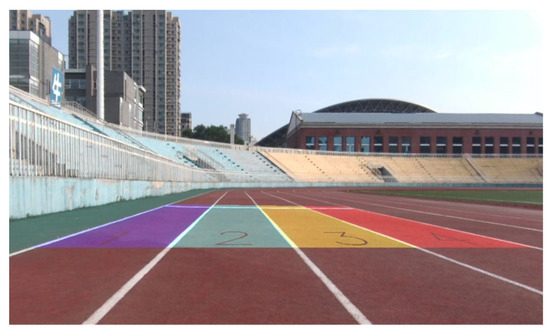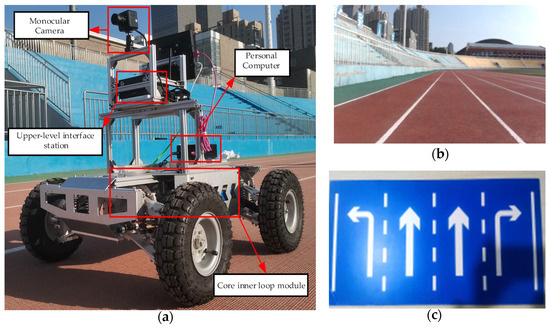 To verify the accuracy of the proposed method and to assess the impact of the algorithm under various scenarios, a track was utilized to simulate lane lines while considering the conditions of a school playground. A handcrafted KT board was used as a four-lane traffic signboard. The experimental vehicle, equipped with a monocular camera, functioned as an intelligent car. Figure 14 illustrates this setup. Furthermore, the environment and equipment in the experimental images were scaled down proportionally. Using the ratio of the width of the running track to the width of domestic lanes as a benchmark, a monocular camera was set up on the experimental car, and a four-lane traffic signboard was created to a relative scale, as illustrated in Figure 14.