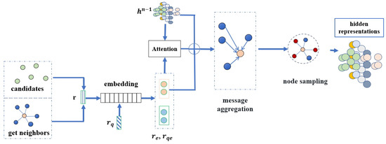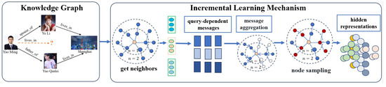 The framework of AGNN-ILM is shown in Figure 1. AGNN-ILM initially applies the incremental learning mechanism to acquire neighboring nodes and generates a collection of newly visited nodes, which are subsequently regarded as candidate nodes. Subsequently, the incremental learning mechanism computes the independent query messages by leveraging the corresponding edges. Afterward, candidate node information is aggregated, and the nodes are sampled to generate hidden representations. The predicted target entity is then identified by evaluating the highest score derived from the hidden representations. AGNN-ILM consists of n layers of graph neural networks, and the propagation path of AGNN-ILM is adaptively adjusted instead of fixed before the message propagation. The model structure of AGNN-ILM is shown in Figure 2. In detail, AGNN-ILM obtains the neighboring entities in the nth propagation step by
