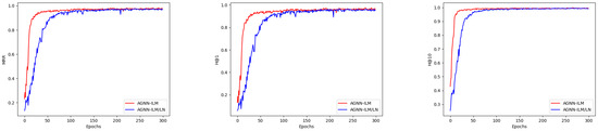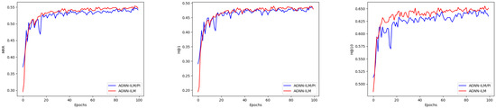 To validate the impact of the layer normalization technique in the incremental learning module, we conducted a performance comparison between AGNN-ILM and AGNN-ILM without the layer normalization technique (AGNN-ILM/LN). As shown in Table 6, AGNN-ILM and AGNN-ILM/LN achieved the same performance on the UMLS dataset. It can be noted that AGNN-ILM demonstrated more stable performance compared with AGNN-ILM/LN during the training process in Figure 7, indicating the role of the layer normalization technique in improving the stability of the model. As can be seen in Figure 8, AGNN-ILM/LN exhibited slower convergence speed and inferior performance compared to AGNN-ILM, demonstrating that the layer normalization technique can effectively improve the performance of the model.