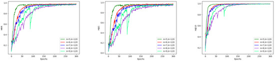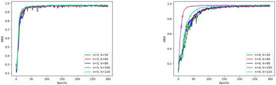 To investigate the impact of the number of sampling nodes in the incremental learning module on model performance, we conducted an ablation experiment on the UMLS dataset. The experimental results are shown in Table 8. In the scenario where AGNN-ILM incorporates a five-layer graph neural network, the model performance initially shows a decline but subsequently improves with an increase in the number of sampled nodes. In the scenario where the AGNN-ILM consists of a six-layer graph neural network, the performance of AGNN-ILM improves as the number of sampling nodes increases, reaching the peak when the number of sampling nodes reaches 100. When the number of sampling nodes is set to 100, AGNN-ILM achieves optimal performance regardless of whether n is 5 or 6. The overall performance of AGNN-ILM is inferior to that of when k is set to 120, which demonstrates that increasing the number of sampling nodes does not necessarily lead to performance improvement. Figure 9 presents the training curves of the model with different numbers of sampled nodes when n is set to 5 or 6. From Figure 9, we can observe that the performance of the model is not significantly affected by the different numbers of sampled nodes when . The number of sampled nodes significantly affects the convergence speed of the model when . It can be noted that the model exhibits the fastest convergence speed when . Both an excessive or insufficient number of sampled nodes can impact the convergence speed of the model. Therefore, establishing an appropriate number of sampling nodes is crucial for guaranteeing model performance.