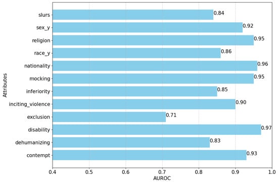Table 1 illustrates the distribution of fine-grained features in the “hate” subset of the FHMC dataset. To ensure these fine-grained labels positively impact the model’s learning, we employed the same encoding–decoding method to train each label individually and removed categories with AUROC scores below the human-recognizable threshold of 0.82, as shown in Figure 2. Combining Table 1 and Figure 2, it is evident that the “exclusion” category has an AUROC score of 0.71 for our model architecture, significantly lower than other categories. Also, the “exclusion” category has too few samples in the training and validation sets. Therefore, this experiment will no longer consider the “exclusion” category. Given the richness of fine-grained feature categories and the scarcity of samples in some categories, we adopted a weighted loss transfer learning method to handle these labels, with the specific algorithm as follows: