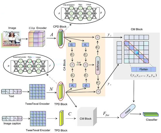 In Equations (4), (5), (6), and (7), and respectively represent query and key values for textual attention scores, while and represent query and key values for image attention scores. , are linear transformation modules of attention mechanisms used to compute attention scores. ⊗ denotes the matrix outer product. In Equation (8), and denote the attention similarity scores for image and text, denotes the softmax operation, and ∥ represents concatenation. Finally, Equations (9) and (10) weight the similarity scores and onto the image feature A and text feature N, respectively. The design of TPD Block and CPD Block ensures that F and B have the same dimensions. In contrast to the architecture used by Zia et al. [40], this paper employs custom trainable projection layers as post-processing after the encoders, which is a key distinction.