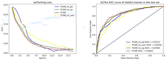 To further validate the effectiveness of the TCAM model, this study compares its final classification performance with various baseline models reported in the literature, as shown in Table 4. Upon observing Table 4, it is evident that TCAM outperforms several baseline methods, such as MMBT, ViLBERT, and VisualBERT. On the FHMC dataset, the best-performing baseline method (Visual BERT) achieves a test set AUROC of 0.77, significantly lower than TCAM’s AUROC value (0.8362). Furthermore, the TCAM model also achieves excellent scores in secondary accuracy evaluation. In contrast, the highest accuracy achieved by the baseline models is only 0.6920. These results indicate that the TCAM model significantly enhances overall performance by integrating image–text and fine-grained feature information. Therefore, the TCAM model exhibits substantial potential in multimodal detection tasks.