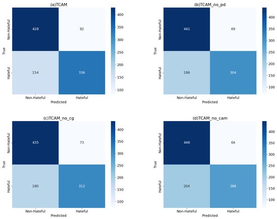 Figure 6 illustrates the confusion matrices of four models—TCAM, TCAM_no_cg, TCAM_no_cam, and TCAM_no_pd—on the FHMC test set. According to Figure 6, the TCAM model performs better in recognizing hateful memes than the other three models. The accuracy calculations yield 0.764 for TCAM, 0.747 for TCAM_no_cg, 0.732 for TCAM_no_cam, and 0.745 for TCAM_no_pd. This situation reaffirms the effective supportive role of transfer learning and image description in identifying weak-related hateful memes. Moreover, on the secondary metric of accuracy, the TCAM model achieved the best performance.