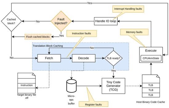 Integration of the framework was made on QEMU 8.2 focusing on the ARM architecture. The native code translation and IO loops were modified to allow monitoring of target memory and instructions during the course of the simulation. This monitoring is needed, since QEMU caches blocks of executable host code, named Translation Blocks (TLB), to prevent continuously repeating translation of target code, thus accelerating the simulation. The QEMU’s execution loop can be seen in