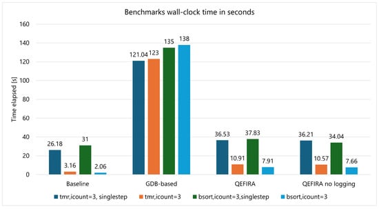 Figure 3 shows the wall-clock time comparison, in seconds, between the runtime injection test with QEFIRA and a GDB-based implementation, such as the one proposed in [