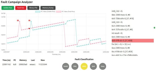 fault run, shown as blue and red dot graphs, respectively. Within this graph, the injection points are highlighted according to their affected PC value and simulation time, whilst, on the right side of the graph, the fault-affected instructions are also automatically highlighted. Below the execution flow graph, the log shows the changes in the memory values pre-injection and post-injection.