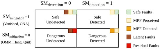 Section 2.3 can be mapped in the matrix. The exception is single point faults which, by definition, assume that no safety mechanism exists to detect and correct them. Notably, latent faults belong on the left side of the diagram, because they are not detected by the SM. Since a latent fault does not cause any function failure by itself, it belongs in the upper quadrants, i.e., Safe. Although, this could also imply a fault affecting the SM itself, rendering it Dangerous with a subsequent fault. The rationale for perceived faults to be cross-plane in the quadrants is similar to latent faults, but pertains to a failure in the SM that asserts a safe state. The fault itself is Dangerous, but tolerable by the safe state. Residual faults belong in the lower left quadrant, as they violate safety goals. On the other hand, Safe faults do not affect the system, as they are always mitigated by the safety mechanism. Lastly, detected faults belong in the lower right quadrant, since the SM will be able to detect but not mitigate them.