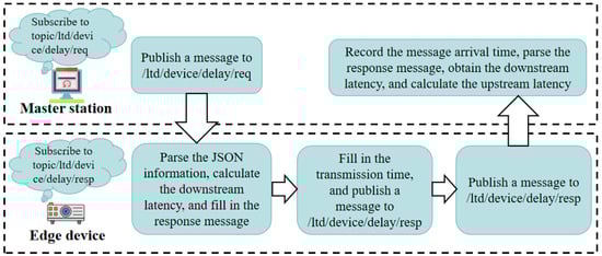 Taking a measurement task as an example, the master station initiates a latency measurement task, assembles the request message, and timestamps it as t1. The message is then pushed to the agreed topic delay_req on the message broker service (hereinafter referred to as broker). Each terminal consumes messages from the topic delay_req, records the message arrival time (t2), and calculates the downstream communication latency of the message as delayDown = t2 − t1. Subsequently, each terminal sends a response message to the topic delay_resp, carrying delayDown and the sending time (t3) data. The master station consumes the upstream message from the topic delay_resp, records the arrival time (t4), parses the message to obtain delayDown and t3, and calculates the upstream latency as delayUp = t4 − t3. The master station program writes the measured values of the upstream and downstream latency, delayUp/delayDown, into the database, completing this round of the latency measurement task. After waiting for a measurement cycle, the next measurement task is executed. If the edge device experiences a disconnection, the main site will not receive the response message, resulting in an infinite delay.