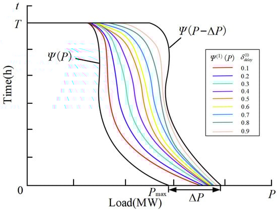 Based on historical data within a certain period, the user’s equivalent load curve Ψ(P) can be obtained, where the horizontal axis represents the user’s load power and the vertical axis represents the duration of the load. T denotes the time period, and any point on the curve indicates that the duration for which the user’s load is greater than or equal to P is t, with Pmax representing the maximum value of the user’s load. The response capability of a certain device is denoted as ΔP. When the device is in a state of high latency, the user’s equivalent load curve can be represented as Ψ(P − ΔP), which is equivalent to shifting the continuous load curve to the right by ΔP of load.