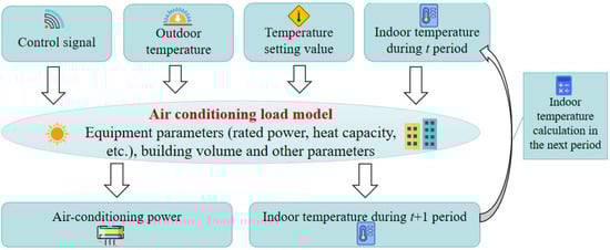 For the modeling of split air conditioning (AC), refer to the method proposed in [48]. The physical model input parameters for participation in response include the control signal, outdoor temperature, indoor temperature setpoint, and indoor temperature at time t, with the outputs being the air conditioning power and the indoor temperature for the next time period. In addition, the model should consider the air conditioning unit’s own parameters and the parameters of the building volume. For ease of calculation, these parameters are set as constants based on statistical results. The architecture of the split air conditioning load model is shown in Figure 7.