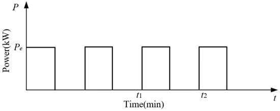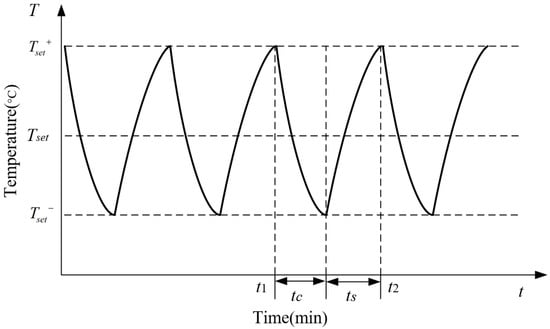 The corresponding operating power of the central air conditioning system is shown in Figure 9, with the operating power switching between the rated power and zero. The durations for which the central air conditioning system is in the cooling and shutdown states are denoted as tc and ts, respectively.