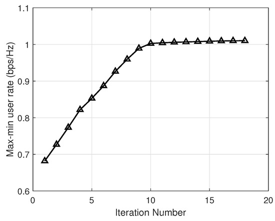 Figure 2 depicts the convergence trend of the algorithm we proposed, which achieves convergence within 20 iterations. The proposed algorithm shows substantial performance enhancement, achieving a 40% boost in the max-min user rate from the starting iteration until convergence. Moreover, after the first 9 iterations, during which the objective value experiences rapid growth, the subsequent iterations indicate a trend towards stability. Overall, the algorithm exhibits a monotonically non-decreasing behavior.