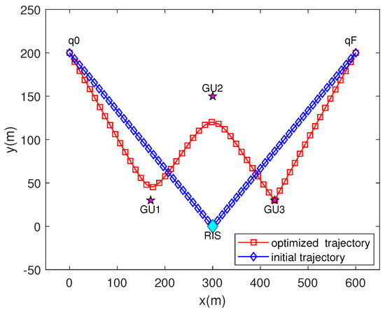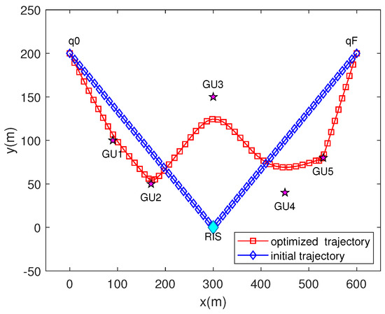 In our simulation results, “W/o traj” refers to the proposed scheme without UAV trajectory optimization, “W/r beam” indicates the proposed scheme with random beamforming, and “A/u sche” signifies the average distribution of user scheduling time. The RIS’s coordinate is . There are five GUs whose coordinates are , , , , . The UAV starts at position and ends at position . Other parameters include , s, dBm, , , , , , dB, dB and [24]. The remaining simulation parameters are detailed in Table 1.