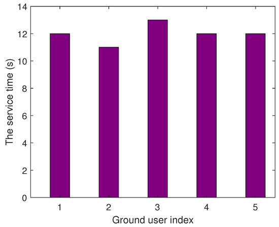 Figure 5 illustrates the varying service times provided by the UAV to each ground user. GU2 enjoys a shorter service time due to its proximity to the RIS and the UAV’s trajectory directly passing over GU2. Conversely, GU3 experiences a longer service time as it is farther from the RIS and not directly beneath the UAV’s trajectory. These adjustments aim to ensure a fairer distribution of service among all users.
