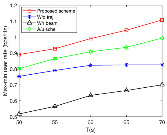 Figure 6 illustrates the max-min user rate versus service time T of different schemes. Increasing the service time leads to a higher max-min user rate. This improvement arises from the UAV’s ability to remain in an optimal position for longer durations, enhancing its ability to serve users effectively. By adjusting its trajectory according to the positions of the RIS and users, the UAV can achieve better positioning, thereby boosting the average transmission rate. On the contrary, reducing the service duration could restrict the UAV’s capacity to arrive at an ideal location during the allocated time, thus affecting its overall performance. Simulation results demonstrate that the proposed scheme can achieve a higher max-min user rate than the “W/o traj”, “A/u sche” and “W/r beam” schemes. Furthermore, optimizing the UAV’s transmit beamforming yields the greatest improvement in the max-min user rate.