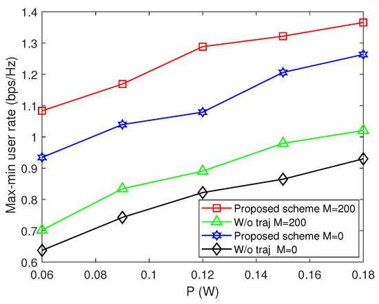 Figure 7 illustrates the max-min user rate for different schemes versus UAV velocity under conditions of and W. The proposed approach demonstrates improved performance as UAV velocity increases. When the UAV’s velocity is capped at 11 m/s, there is a sharp decline in the max-min user rate. This decline is attributed to the UAV’s trajectory being unable to directly cover the users and the limited time available for hovering. Conversely, once the UAV’s velocity surpasses 13 m/s, its trajectory stabilizes. Nonetheless, an increase in UAV velocity leads to extended hover times above the users, resulting in a more consistent growth in the max-min user rate. Furthermore, we compared scenarios where the UAV was equipped with 2 and 5 transmitting antennas. The findings revealed that augmenting the antenna count significantly boosts data transmission rates. This enhancement is due to the increased precision in beamforming and higher signal gain achieved by the additional antenna elements, ultimately elevating signal strength and transmission rate. Additionally, the multi-antenna setup provides superior interference resistance, guaranteeing data transmission.