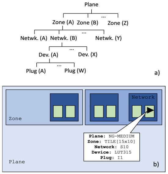 The reconfigurable matrix is loosely based on the island-style FPGA model, where arrays of logic blocks are interposed with routing channels. Input and Output Buffers (IOBs), clock generators and, in the case of the newer devices (i.e., NG-ULTRA), interfaces for the processor are located at the edges of the programmable logic. The logic resources are spatially organized in a descendent tree manner, with the highest level being Plane followed by Zone, Network, Device, and Plug, as shown in Figure 1a. The Plane represents the whole programmable logic matrix and it is associated with the model of the FPGA chip (namely, Variant). The Zone is the first subset of resources, either logic (e.g., Tile and CGB) or for global routing purposes (e.g., Mesh), and interfaces (e.g., Fence, JTAG, IOB). The Networks are further subsets within the Zone while Devices and Plugs represent a physical resource and its pins. For instance, an input pin (e.g., Plug: I1) of a LUT (e.g., Device: LUT315) in the NG-MEDIUM variant can be described in Figure 1b. Finally, the Plugs of a Device can be mutually distinguished into Emitter (i.e., output pin) and Receiver (i.e., input pin). Moreover, it is useful to note that Zones names are unique (e.g., TILE [15 × 10] univocally identifies the Tile located in the 10th row and 15th column of the reconfigurable matrix), while Networks, Devices and Plugs names can be repeated among zones, although they will be still unique within the same one (e.g., with respect to the example shown in Figure 1b, a device named LUT315 appears in both zones TILE [15 × 10] and TILE [2 × 2] among the others but, within a given one, it is unique). In this way, a list as: