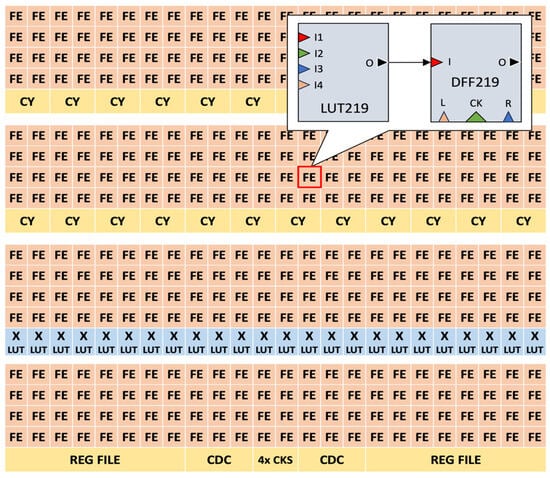 Detail of a Tile in the NG-MEDIUM architecture with focus on the FE and its components. The Tile includes also additional logic such as Carry logic (CY), High-performance LUT (X-LUT), Register File and others.