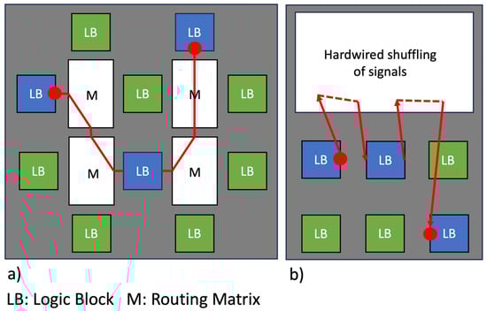 The figure explains the difference between the two routing models inside a Tile. (a) Routing by means of switch matrices, where the delay is dependent on the physical distances among the routed logic blocks; (b) Routing by means of shuffling matrix, where the delay only roughly depends on how many times the route enters the matrix.
