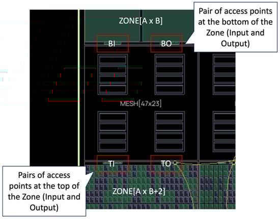 Floorplanning view from the Impulse tool. Access points at the top (TI and TO) and bottom (BI and BO) of two Zones allow the routes to enter the general routing channels through the Mesh.