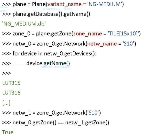 Once the database loading routine has been chosen, the system starts to fetch data accordingly. A top structure is created and associated with the Plane, given the variant as input argument. The Variant class couples the Plane with the respective database unless the latter is manually overwritten by the user. The plane contains a Python dictionary that has the first level of hierarchy as keys (i.e., Zones) and the objects themselves as values, as well as other useful getter methods (e.g., getName(), getID(), getZone(name), and so on). This approach is necessary in order to avoid any duplication of a class object referred to the same element, so it will be unique as well as its attributes. This structure is repeated for each level of the hierarchy, allowing an agile exploration of the whole programmable logic. Each object also contains the reference to its parent, so that it is possible to retrieve it at any moment. This interface fully integrates with the Python object-oriented programming paradigm, for instance, exploiting iterators that allow the user to use cycles and indexing on the returned objects. Figure 6 gives an example of the flexibility of the exploration from the Python command line using NXRouting.