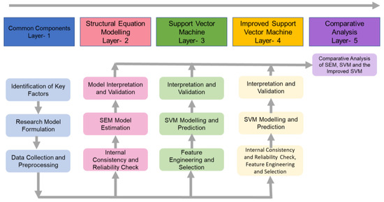 The framework’s architecture comprises five distinct layers: starting with the foundational Common Components layer, followed by Structural Equation Modelling (SEM), Support Vector Machine (SVM), Improved SVM, and culminating with a Comparative Analysis layer. This structured approach allows for a more nuanced analysis than single-algorithm models, enhancing our understanding of the direct effects of AI on academic outcomes.
