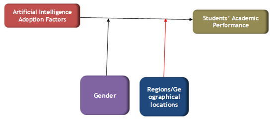 The research model delineates the principal elements and correlations in predicting AI adoption’s impact on students’ academic performance. This model integrates three primary aspects: AI adoption factors, moderating factors such as gender and regional/geographical differences, and the outcome variable.