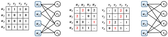 Illustration of exploiting second-order neighbors in a user–item bipartite graph to construct user–user and item–item connections. The first graph shows the original user–item bipartite graph based on the original user–item interaction matrix. A value in the constructed user–user and item–item matrix indicates the number of paths between two nodes. In this example, the second-order neighbors with the most number of paths are selected, as indicated by the values in red. For user and item , since there are two neighbors with the same number of paths, one is selected randomly. The second graph shows the new graph, which adds user–user and item–item connections based on the selection results.