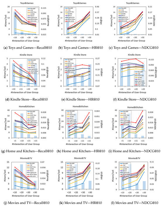 To demonstrate the capability of EIR-GCN in handling users with limited interactions, we conducted experiments to study the performance of our method and other competitors across user groups with different sparsity levels. For each dataset, users were clustered into four groups based on their number of interactions in the training data. Taking “Toys and Games” as an example, users were divided into four groups based on the number of interactions: less than 10, 20, 30, and more than 30. Figure 2 shows the performance in terms of HR@10, Recall@10, and NDCG@10, for different user groups across four datasets. These figures also indicate the number of users in each group, showing that most users have fewer than 30 interactions, highlighting the common sparsity problem in real datasets. From the results, we derive the following observations: