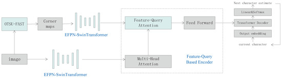 Figure 1 illustrates the system architecture. Initially, the input image is processed by an OTSU-FAST (features from accelerated segment test) corner detector, producing a corner map. The original image and the corner map are then separately inputted into the SwinTransformer [12] for feature extraction. The extracted raw image features are processed using a self-attention mechanism to capture local features, which are then combined with the corner point features using a Feature-Query Attention mechanism to capture global features. The encoder produces the feature map, which is then used by the decoder to extract a series of characters.