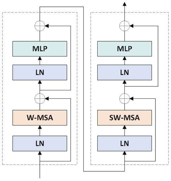 The SwinTransformer Block module is shown in Figure 3. The SwinTransformer module amalgamates both the W-MSA (window-based multiheaded self-attention) and the SW-MSA (shifted window-based multiheaded self-attention) mechanisms. Each MSA module is preceded by a Layer Normalisation (LN) layer, while the latter stages incorporate an additional two layers of Multi-Layer Perceptrons (MLPs). Unlike the standard Multi-Headed Self-Attention (MSA) module in the Transformer Block, the Window-based Multi-Headed Self-Attention (W-MSA) computes the self-attention of local non-overlapping windows instead of global self-attention. This results in SwinTransformer having only linear complexity, while the standard Transformer has quadratic complexity, thereby reducing algorithmic complexity and computation. However, different window information cannot be communicated across windows, which may lead to reduced modeling capabilities. To enhance cross-window connectivity, Shifted Window-based Multi-Headed Self-Attention (SW-MSA) achieves the exchange of information among otherwise non-communicating windows by moving the windows, thus maintaining global information.