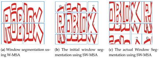An example of SwinTransformer module window segmentation is shown in Figure 4, where the feature map is segmented into non-overlapping windows of size N × N by the Window Multi-head Self-Attention layer (W-MSA). As illustrated in Figure 4a, attention computation is performed within each window, with the specific operations of sliding windows depicted in Figure 4b,c The initially obtained image blocks after segmentation are shifted and concatenated to yield the final actual window-segmentation approach. For instance, as shown in Figure 4b,c, the number of SW-MSA windows is reduced from 9 to 4, thereby reducing computational load while maintaining global information.