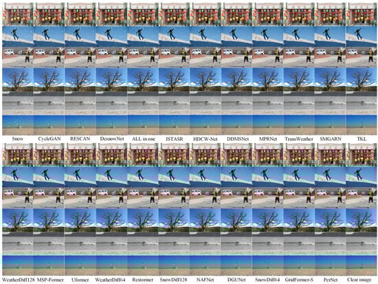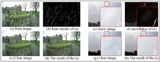 The purpose of image-restoration is to enhance image quality and improve image information, thereby improving visual perception and recognition capabilities, and providing better image-processing and -analysis results for various application scenarios. Images captured by cameras are often affected by noise such as snowflakes, rain streaks, fog and underwater blur. These noises can significantly reduce the clarity and quality of the images, thereby affecting the accuracy of downstream tasks such as object detection [1], image classification [2], stereo matching [3] and image recognition [4]. These useless noises not only degrade the image quality but also mislead deep learning models [5,6,7,8], leading to incorrect decisions and analysis.