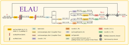Figure 3 illustrates the structure of each identical small ELAU within the PPELAM. In order to ensure the lightweight and efficiency of the model, the module first performs two convolutions for coarse feature extraction. The batch size, channel size, height and width are then calculated based on the tensor size, and these four parameters are not calculated sequentially, but only to facilitate the later operations. Here, our feature map is processed by PyTorch, and its shape changes from (B, H, W, C) to (B, C, H, W) of a normal image. The heights and widths of the two tensors are then averaged together separately to obtain two average tensors. Then, the two average tensors are reshaped into two three-dimensional shapes, and the convolution operation is performed using a one-dimensional grouped convolutional layer. One of these two reshaped 3D tensors focuses only on the degraded features at the height of the image (vertically), and the other only with the degenerate features at the width of the image (horizontally). Therefore, our network further enhances the model’s utilization of continuous correlation in the horizontal and vertical directions of the image, and at the same time, the operation of focusing on specific features also enhances the lightweight and efficiency of the model. To maintain consistency in feature distribution across channels, we perform group normalization on these two feature maps separately. Next, to focus the model more on the horizontal and vertical directions of the image, we utilize the Sigmoid activation function to map features into the range of 0 to 1. The processed features are reshaped into four-dimensional shapes for element-wise multiplication. Finally, the two feature maps are multiplied element-wise, multiplied with the coarsely extracted input tensor, and then added to the tensor before coarse extraction to form a residual structure, preventing network degradation. Thus, we obtain the output of the ELAU.