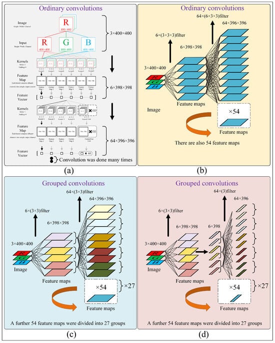 Schematic diagram of the grouped convolution. (a,b) depict standard convolution. (c,d) illustrate grouped convolution. The same color represents features within the same group. In (a,b), all features are of one color, indicating no grouping. In (c,d), the features are grouped in pairs, so every two feature maps share the same color.