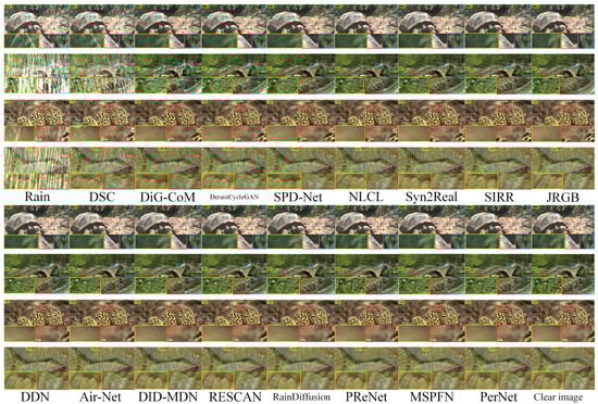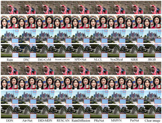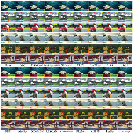 Comparison Models. For the deraining task, we compared the PerNet model against several state-of-the-art methods. The comparative methods on the Rain200L, Rain200H and Rain800 datasets include DSC [33], DiG-CoM [34], DerainCycleGAN [35], SPD-Net [36], NLCL [37], Syn2Real [38], SIRR [39], JRGB [40], DDN [41], Air-Net [42], DID-MDN [43], RESCAN [44], RainDiffusion [45], PreNet [46] and MSPFN [47].