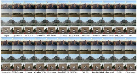 - Valanarasu, J.M.J.; Yasarla, R.; Patel, V.M. Transweather: Transformer-based restoration of images degraded by adverse weather conditions. In Proceedings of the IEEE/CVF Conference on Computer Vision and Pattern Recognition, New Orleans, LA, USA, 18–24 June 2022; pp. 2353–2363. [Google Scholar]