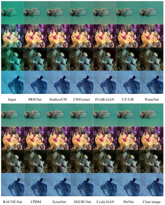 - Peng, W.; Zhou, C.; Hu, R.; Cao, J.; Liu, Y. RAUNE-Net: A Residual and Attention-Driven Underwater Image Enhancement Method. arXiv 2023, arXiv:2311.00246. [Google Scholar]