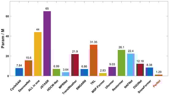 Comparison Models. For the desnowing task, we compared the PerNet model against a range of state-of-the-art methods. The comparative methods on the Snow100K and CSD datasets include CycleGAN [48], RESCAN [44], DesnowNet [29], ALL in one [49], JSTASR [50], HDCW-Net [30], DDMSNet [51], MPRNet [52], TransWeather [53], SMGARN [54], TKL [55], WeatherDiff128 [56], MSP-Former [57], Uformer [58], WeatherDiff64 [56], Restormer [59], SnowDiff128 [56], NAFNet [60], DGUNet [61], SnowDiff64 [56] and GridFormer-S [62].