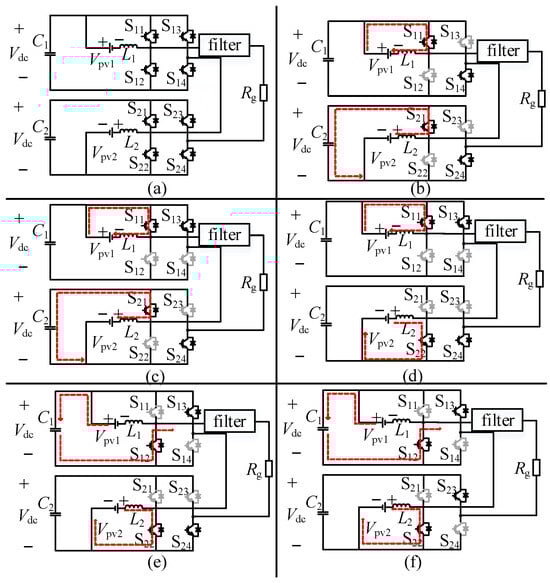 This structure can generate up to five levels of enhanced voltage through different operational modes. Simultaneously, it can produce varying levels of output voltage by adjusting the magnitude of the modulation index (mp). The inverter exhibits five distinct operational modes. As shown in Figure 3b, when switch S11 is conducting, inductor L1 charges in a zero-state series connection with the photovoltaic power source, while the capacitor discharges to supply power to the grid, and the corresponding switch is turned on. When switch S24 is conducting, the energy stored in inductor L2 is discharged to capacitor C2 (Figure 3c). When both switches on one side of the H-bridge are conducting, the output voltage is 0 (Figure 3d). When switch S22 is conducting, inductor L2 charges in a zero-state, and the corresponding switch is turned on (Figure 3e). When switch S12 is conducting, the energy stored in inductor L1 is released to capacitor C1 (Figure 3f). Based on the above description, it can be concluded that the power electronic switches in the inverter must adopt different switching configurations when the inverter outputs different voltage levels.